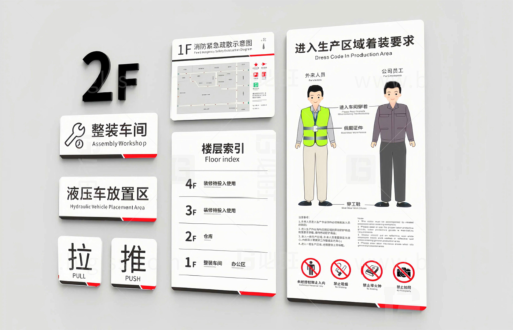 合理布局的導(dǎo)向牌、區(qū)域牌和門牌設(shè)計可以標示緊急出口、急救設(shè)施和安全通道等,增強安全管理,確保員工和訪客在緊急情況下能夠快速撤離。